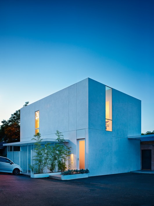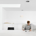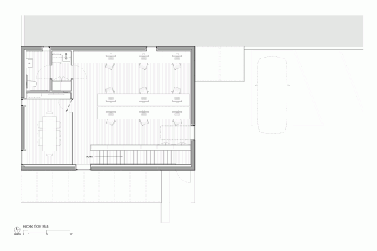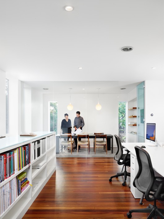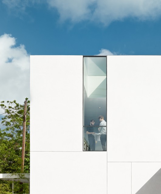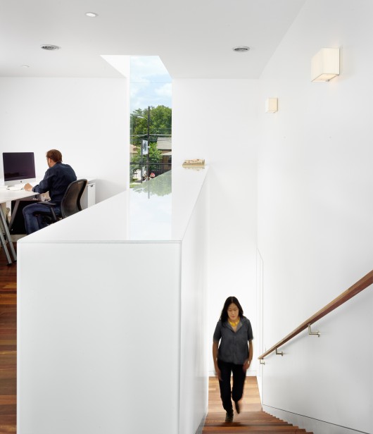 The project is small, comprising accommodations for ten designers, a conference room, kitchenette, bathroom and a materials library and lounge. In response to the image-driven pastiche predominating Austin’s current design landscape, the designers worked with a limited palette and a circumscribed footprint. The result is a stark form clad in smooth white plaster, adorned only by the rhythm of its irregular expansion joints (chosen to incorporate and make sense of the various elevational data inherited form the adjoining TV repair building). A single 3’ by 12’ window/skylight, its glazing flush to the exterior plaster, marks the front façade, acting as dynamic living signage for the firm.