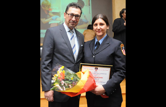 EMS Captain Elizabeth Cascio, Executive Officer to the Commissioner Firefighter Shkendi Demiri, Ladder Company 172