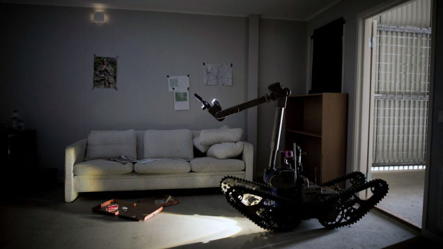 Although this image was captured during police and armed forces exercises in Sweden, it contains a strong message about our common future. The machine is an explosive ordnance disposal robot — and it’s searching a mockup home.