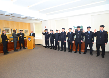 Chief Fire Marshal Robert Byrnes administers the Oath of Office to the new supervising fire marshal and fire marshals alongside First Deputy Commissioner Robert Turner and Chief of Department James Leonard.