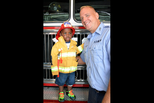 Tuesday, September 22, Justin Chase Pierre and Lieutenant Victor Milukas of Ladder Company 159 were reunited for the first time since August 24, when Lt. Milukas pulled Pierre from an early morning fire in his home in Brooklyn. Shortly after 1 a.m. that day, FDNY received numerous calls for a house on fire. Firefighters arrived minutes later and were informed by neighbors of a child trapped inside. Lt. Milukas proceeded to the second floor where he found Pierre and removed him from a room fully engulfed in flames.